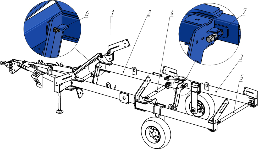 Боковы задние брусья (3) относительно боковых передних брусьев (2) фиксируются на заданный угол при помощи винта (7): выкручен для плавающего (рабочего) режима и закручен до параллельного положения боковых брусьев одного крыла относительно друг друга для «жёсткого» (транспортного) режима АКП.