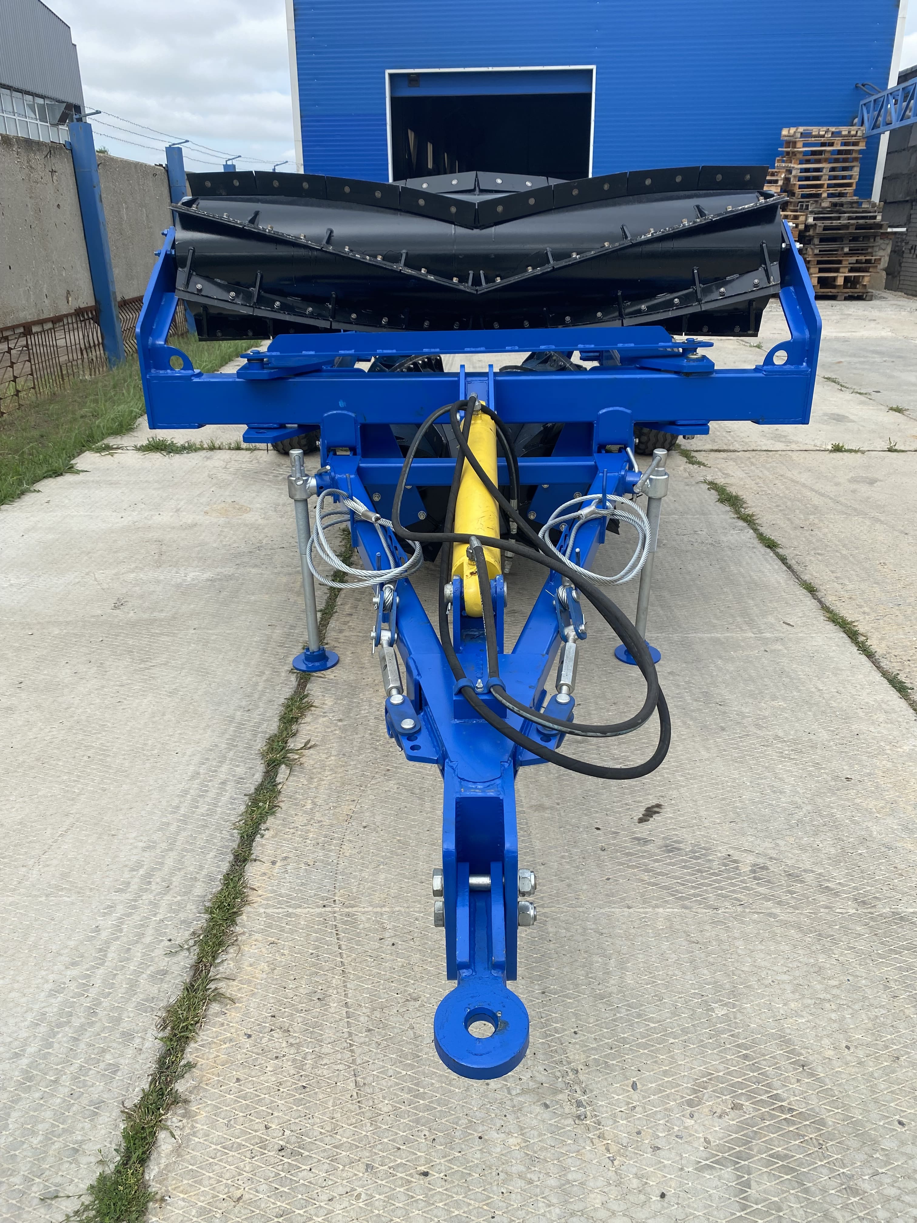 Для перевода АКП в рабочее или транспортное положения служит гидроцилиндр (6). Гидроцилиндр присоединяется к гидросистеме трактора с помощью двух РВД (рукав высокого давления) и разрывных БРС (быстро разъёмных соединений), входят в комплект поставки АКП. РВД соединены с гидроцилиндром штуцерами (Приложение 1). АКП присоединяется к трактору при помощи дышла (12), которое располагается на снице (1). В задней части сницы размещены два домкрата (7). Домкраты в вертикальном и транспортном положениях фиксируются пальцем с шплинтом. Для транспортирования АКП служат два колеса (8).